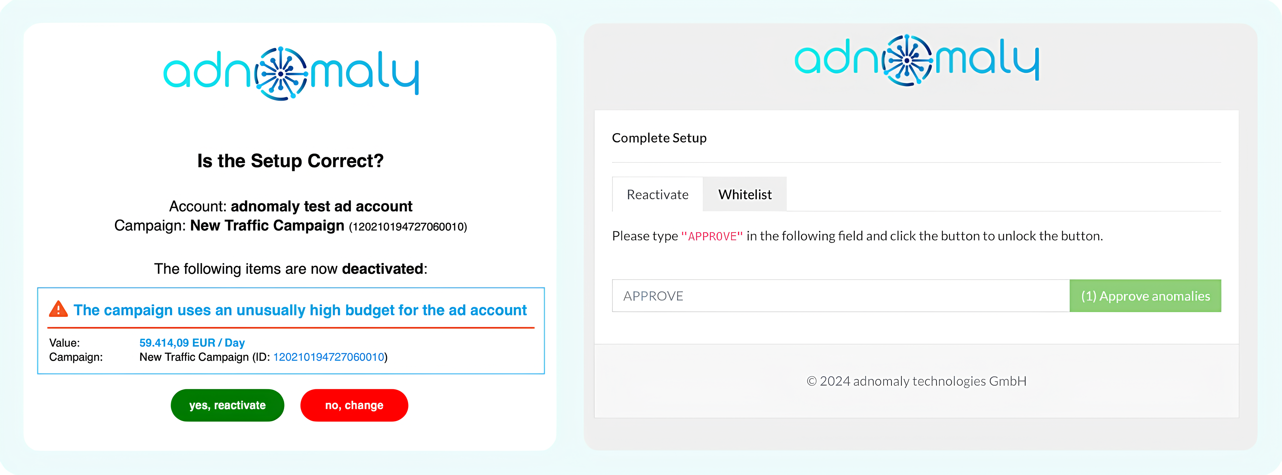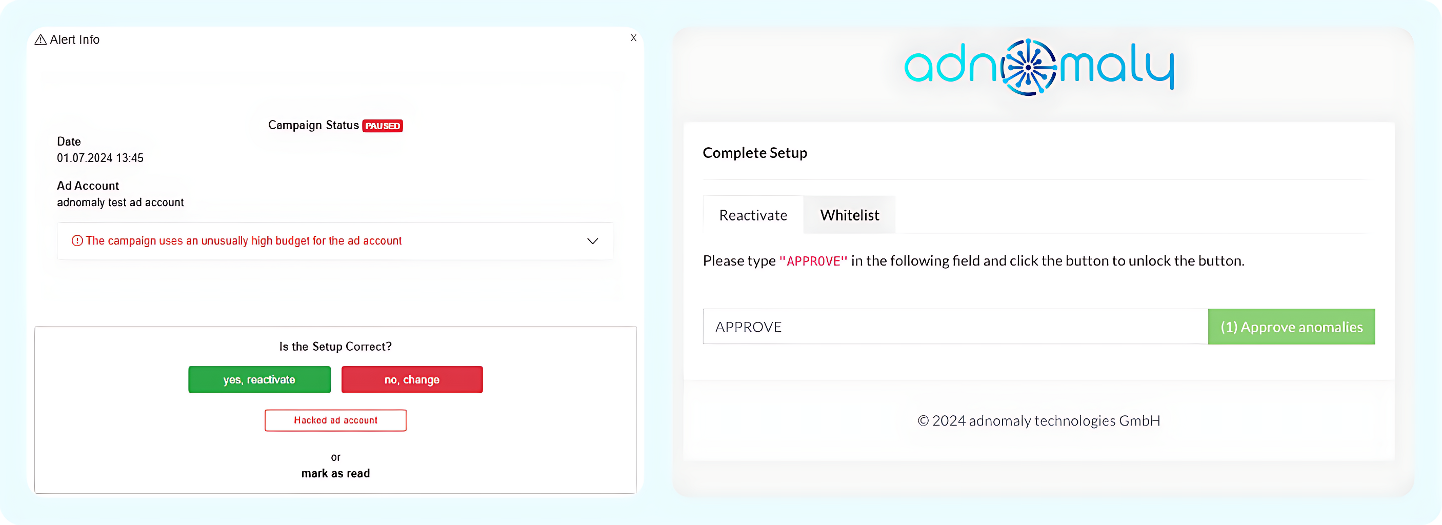 adnomaly acts as a safety check for your campaign setups, similar to two-factor authentication. If you receive an alert and confirm the campaign settings are correct, you must approve them to reactivate the campaign. Here's how to do it.