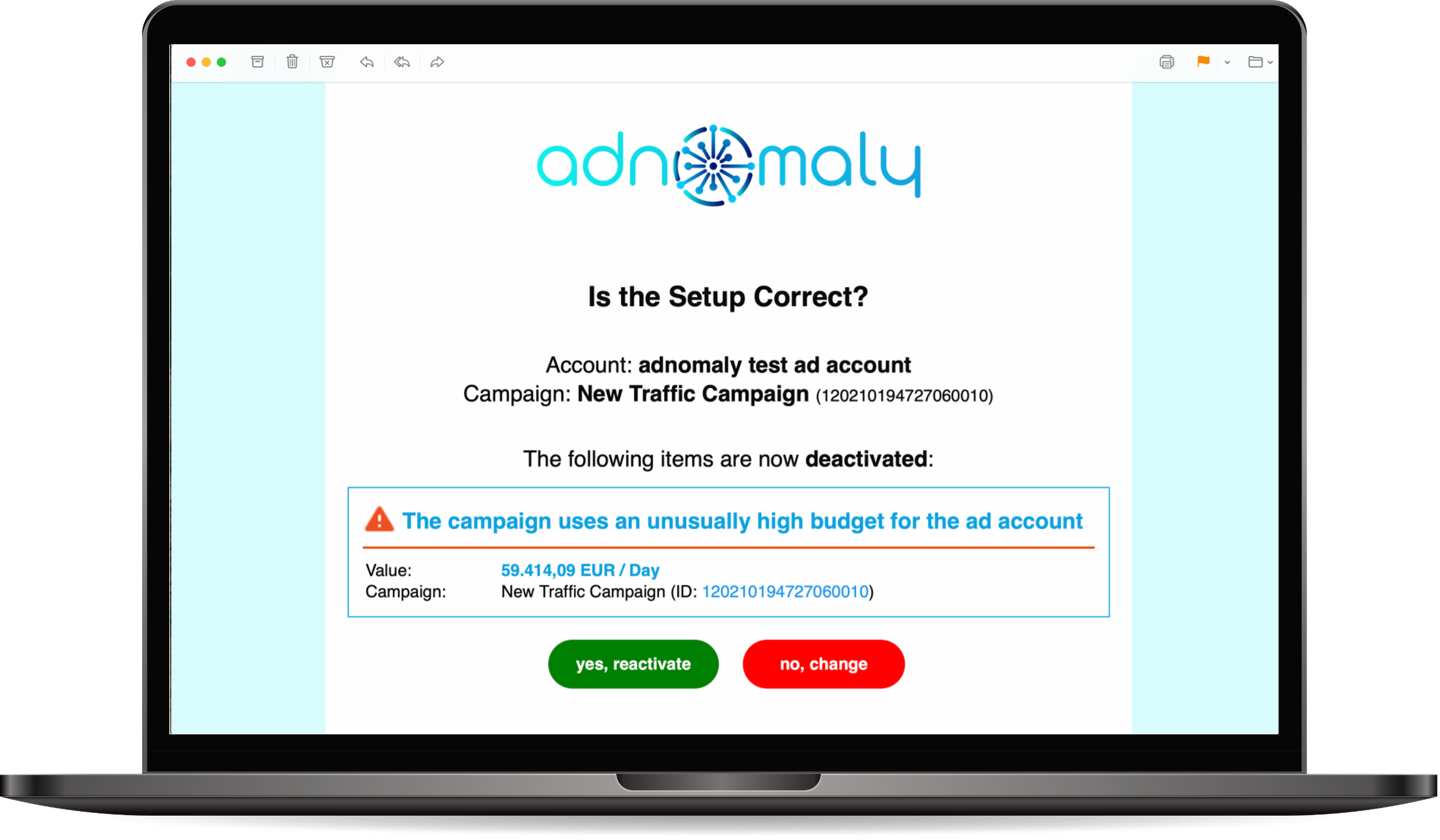 Extra Layer of Verification – adnomaly adds a security layer, similar to Two-Factor Authentication (2FA), to help prevent potential mistakes. By default, adnomaly deactivates campaigns, line items, ad sets, ad groups, or creatives, depending on where the anomaly was detected.