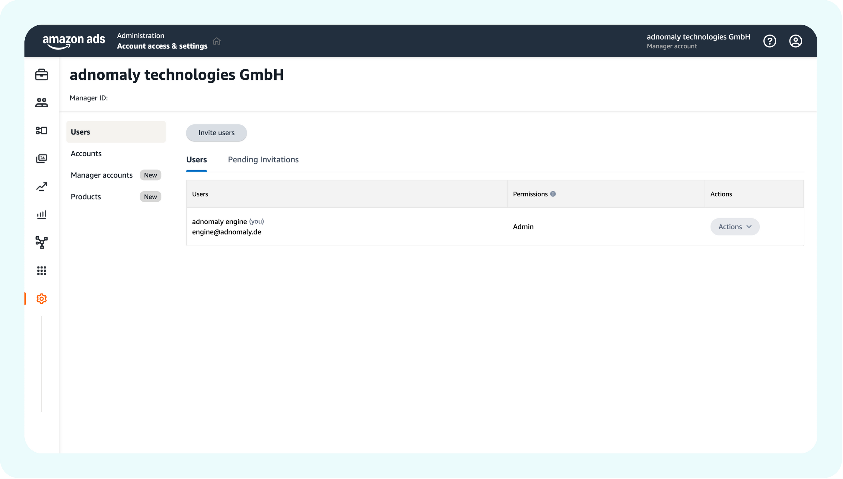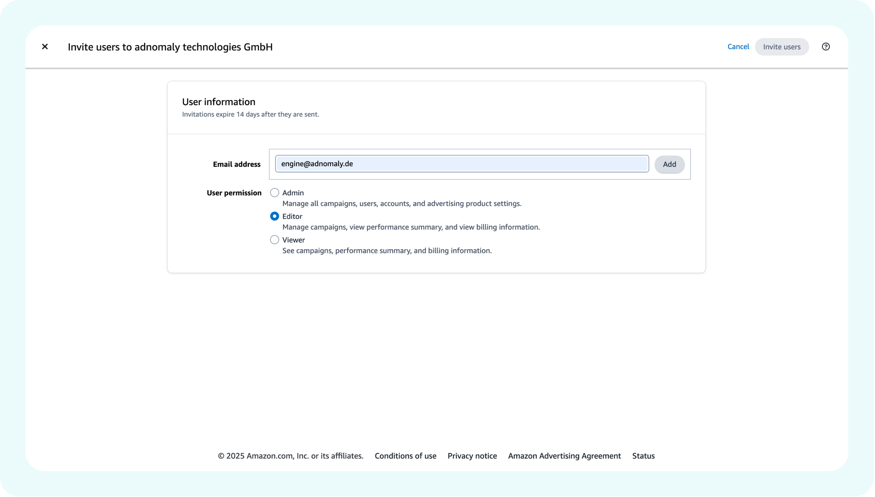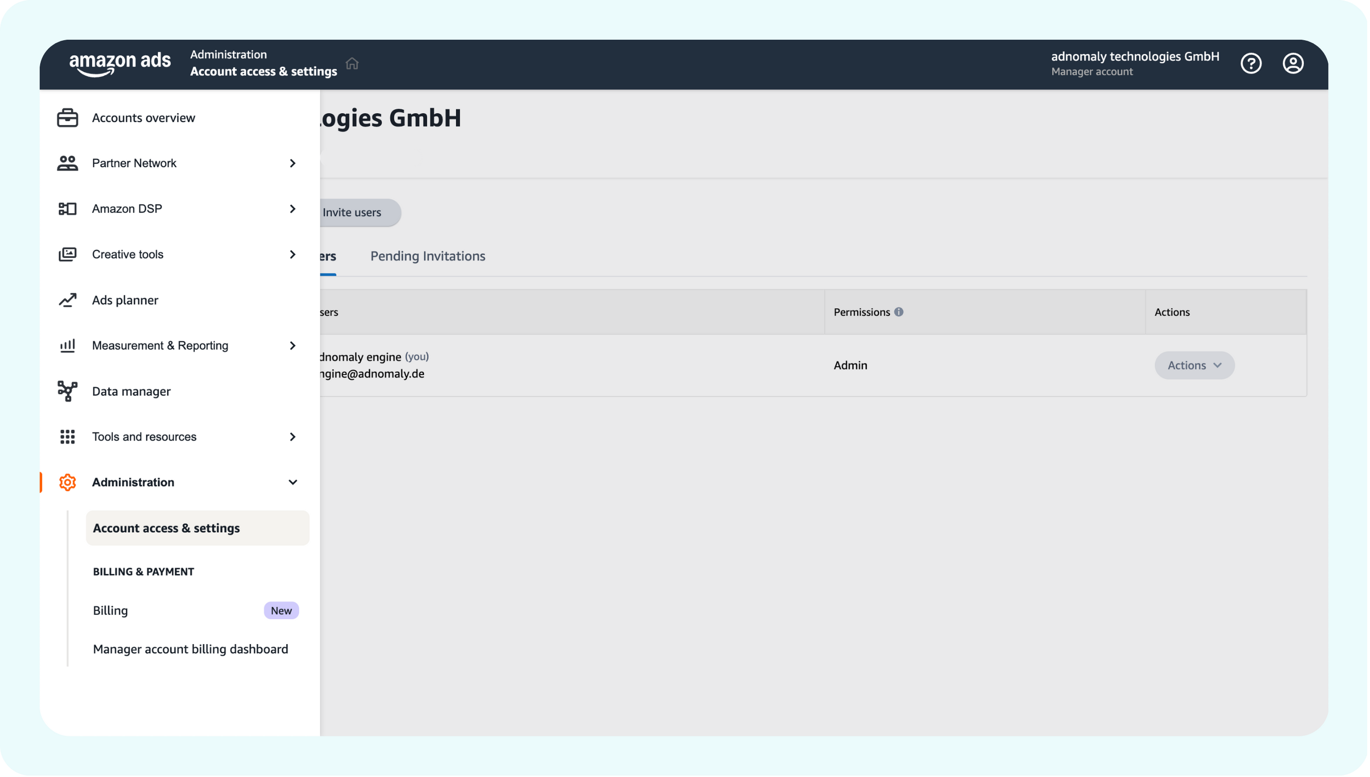 - In the User Management section, invite the adnomaly system user by entering the provided email (engine@adnomaly.de).