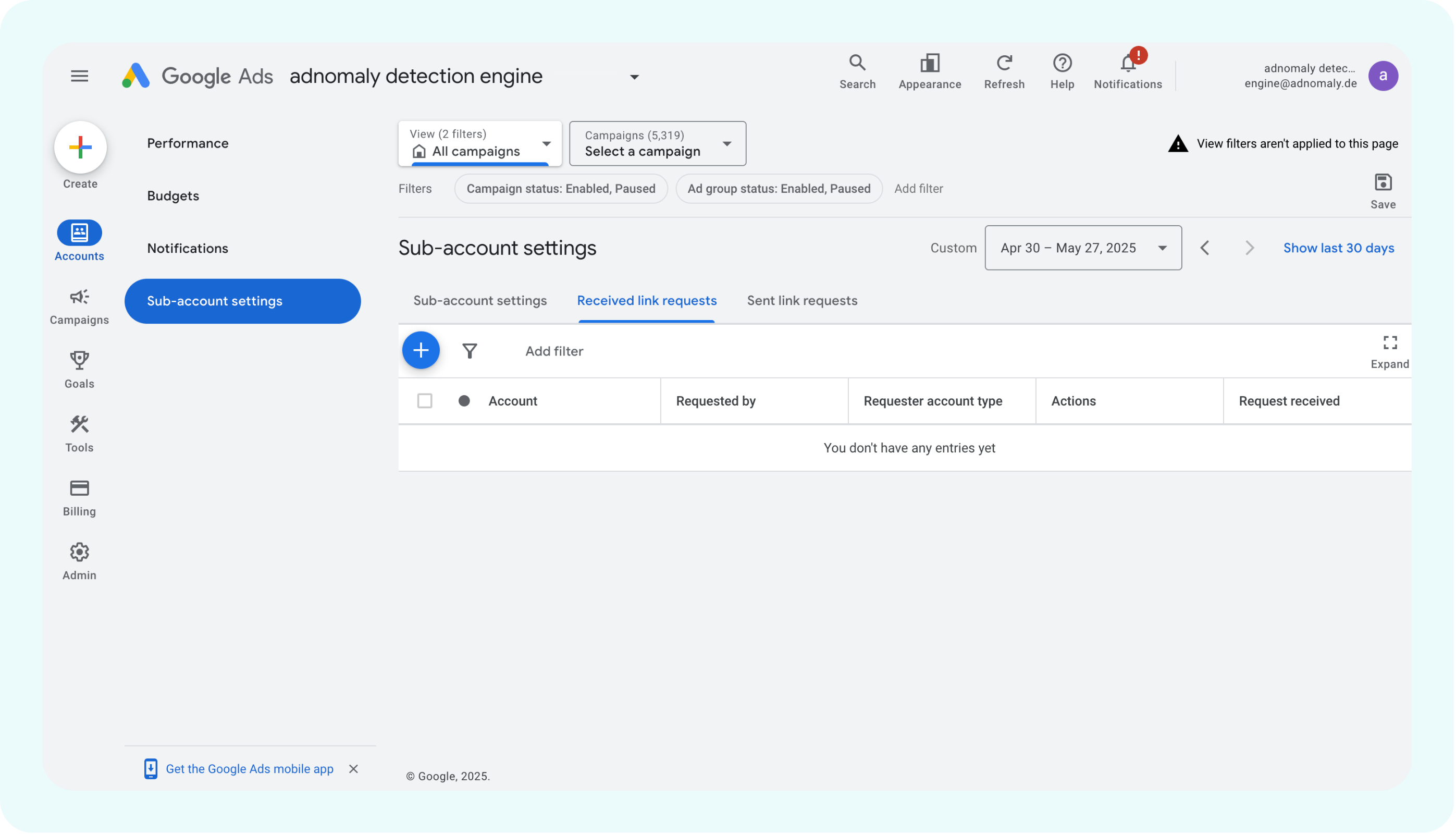 - When accepted, your Google Ads account is now connected to adnomaly.