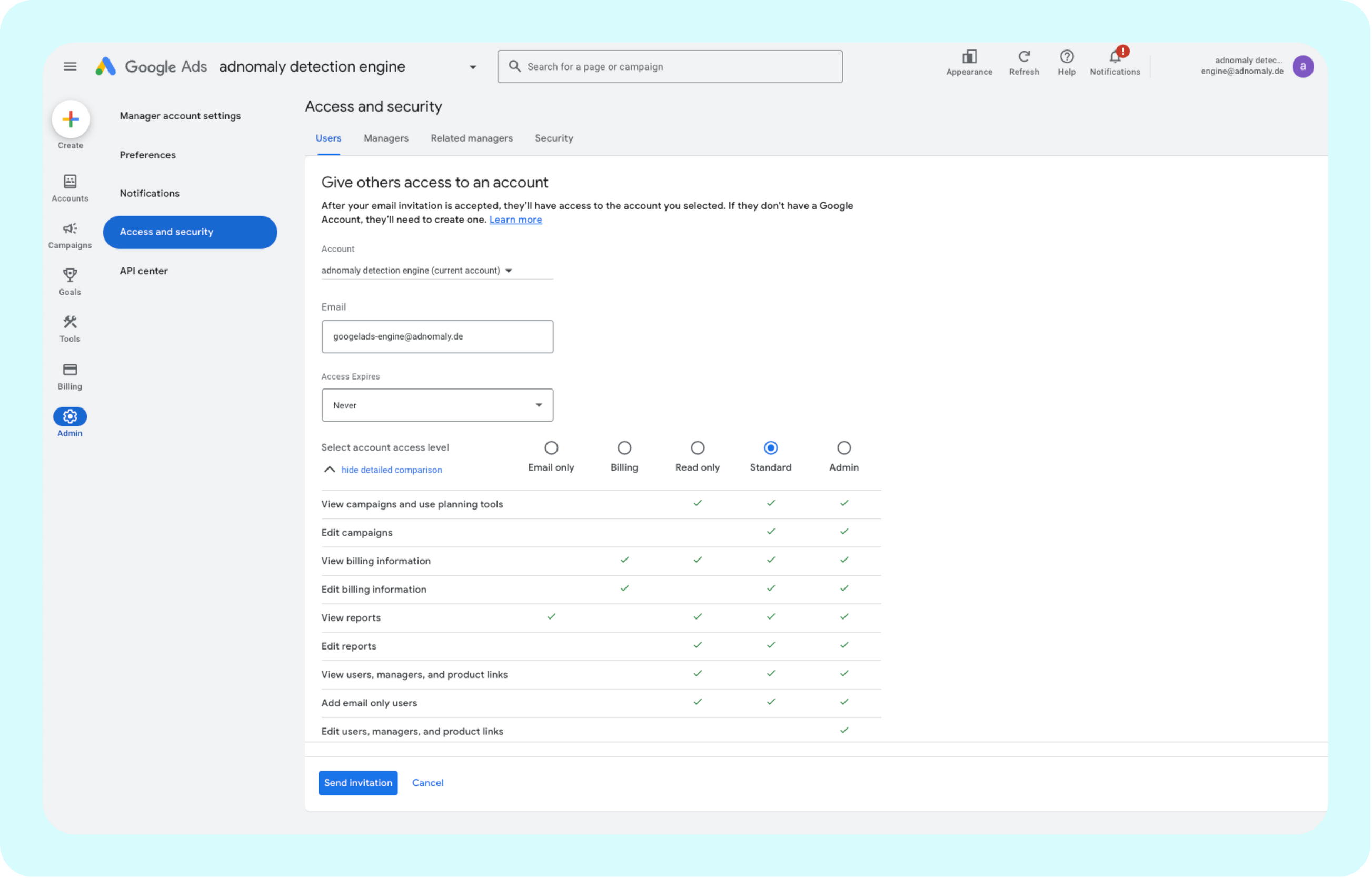 - Enter googleads-engine@adnomaly.de, select Standard access, and click Send Invitation.