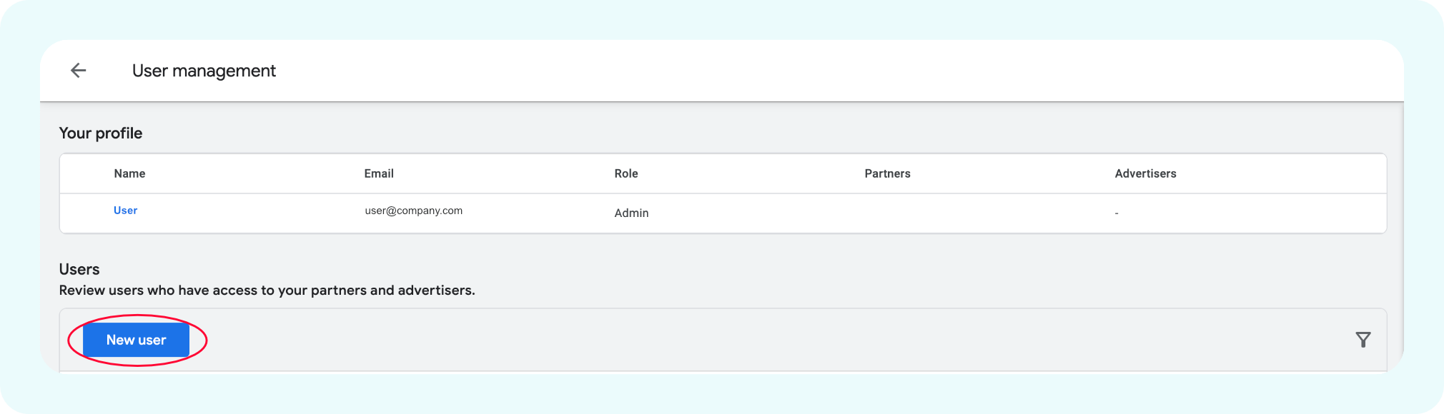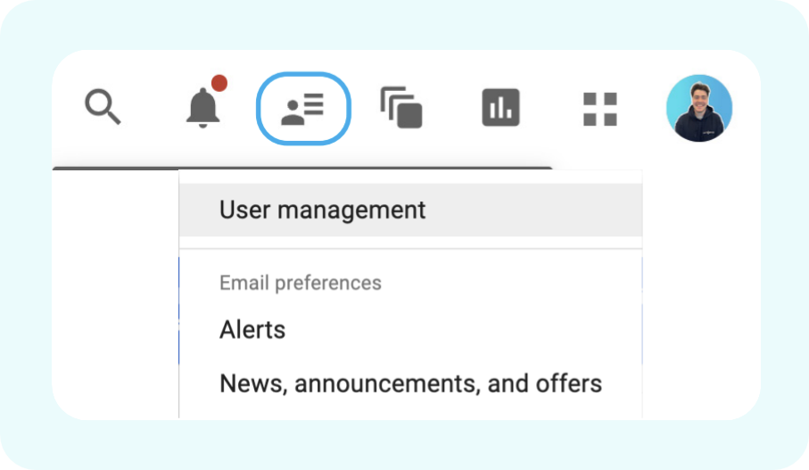 - Go to your DV360 account, and sign in using your credentials. In the top-right corner of the screen, then select User Management.