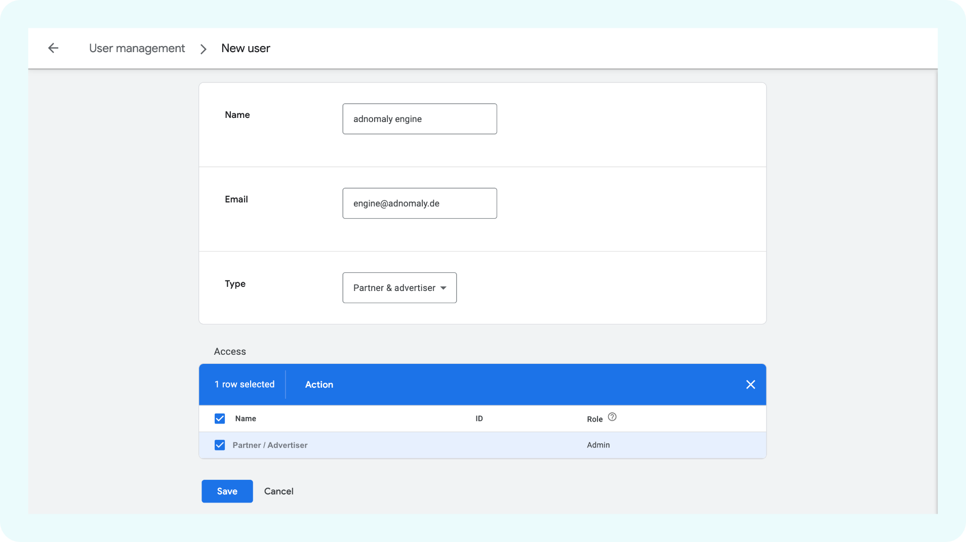 - Add the email engine@adnomaly.de and assign it to the partners and advertisers you want to monitor. This enables the adnomaly to operate within your account.