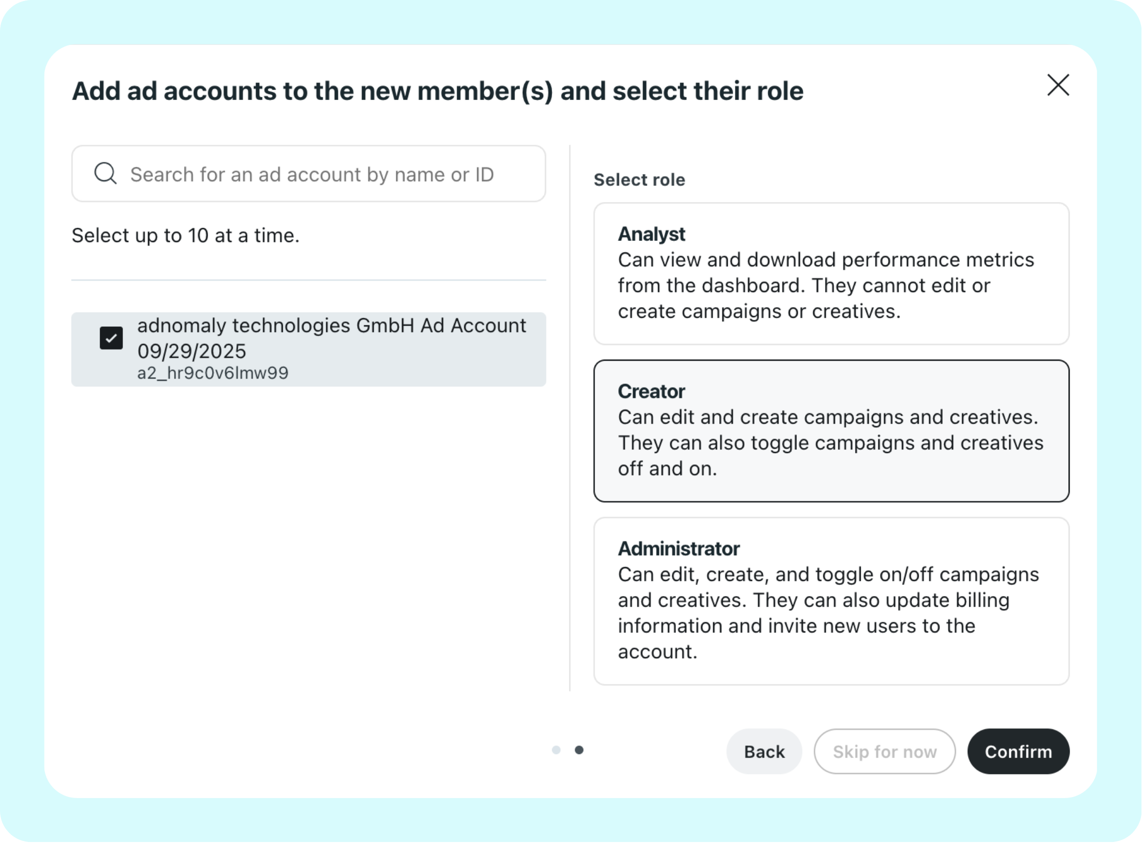 - Select the specific Ad Account(s) you want to connect by checking the box next to the account name. Then, select the Creator role in the right-hand panel and click Confirm.
